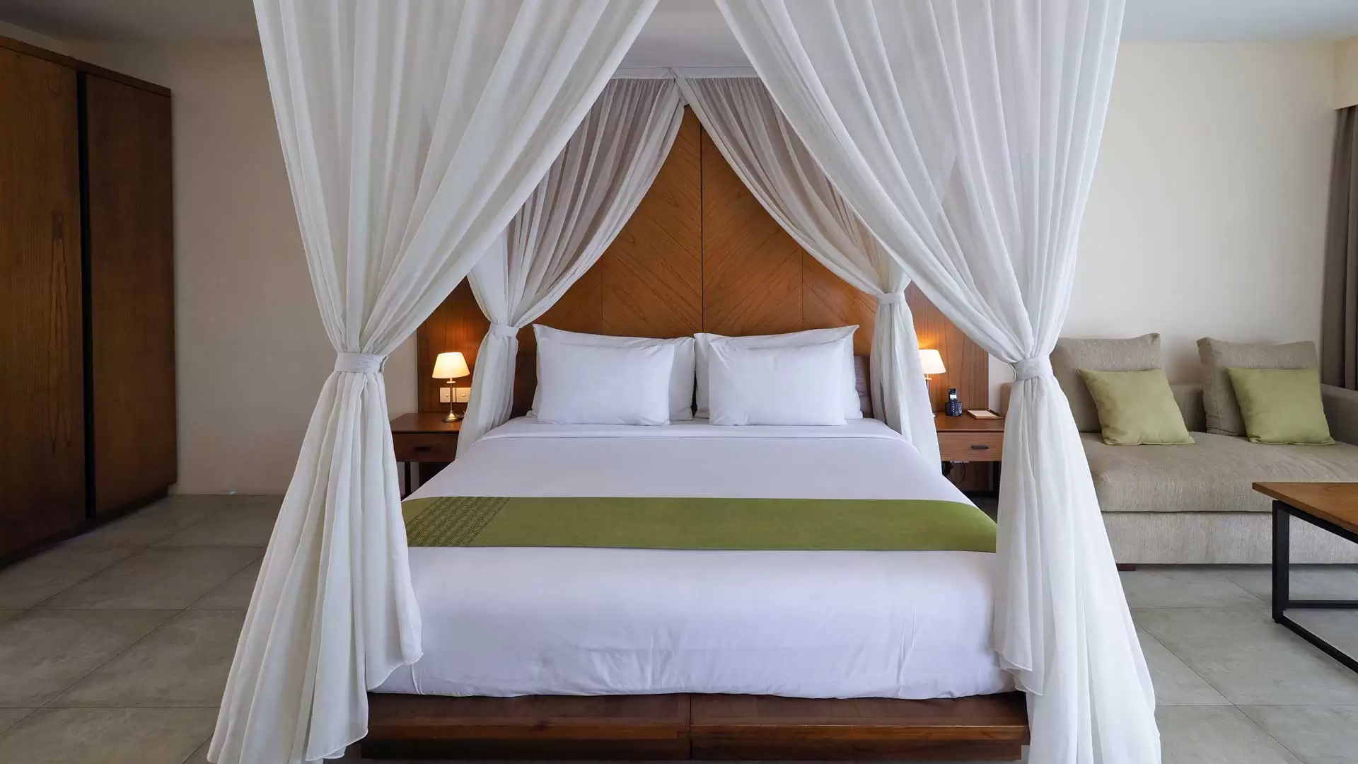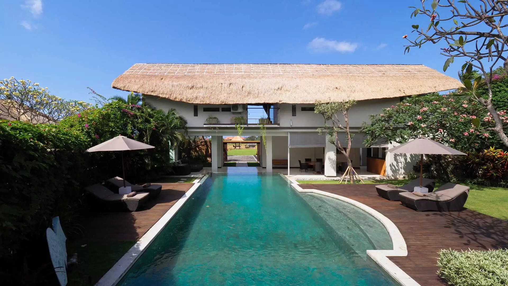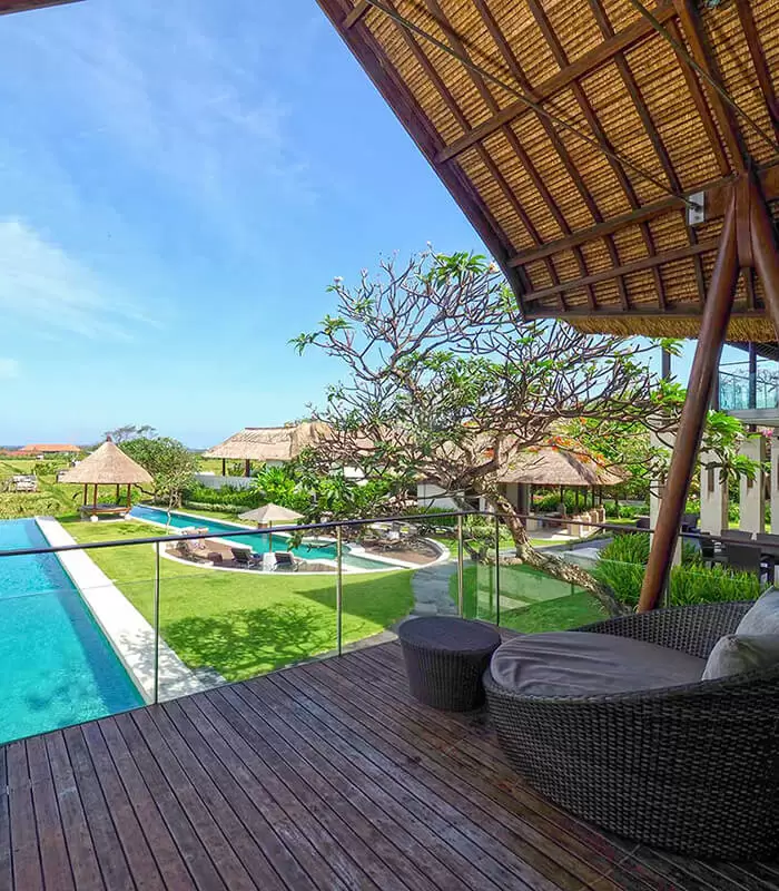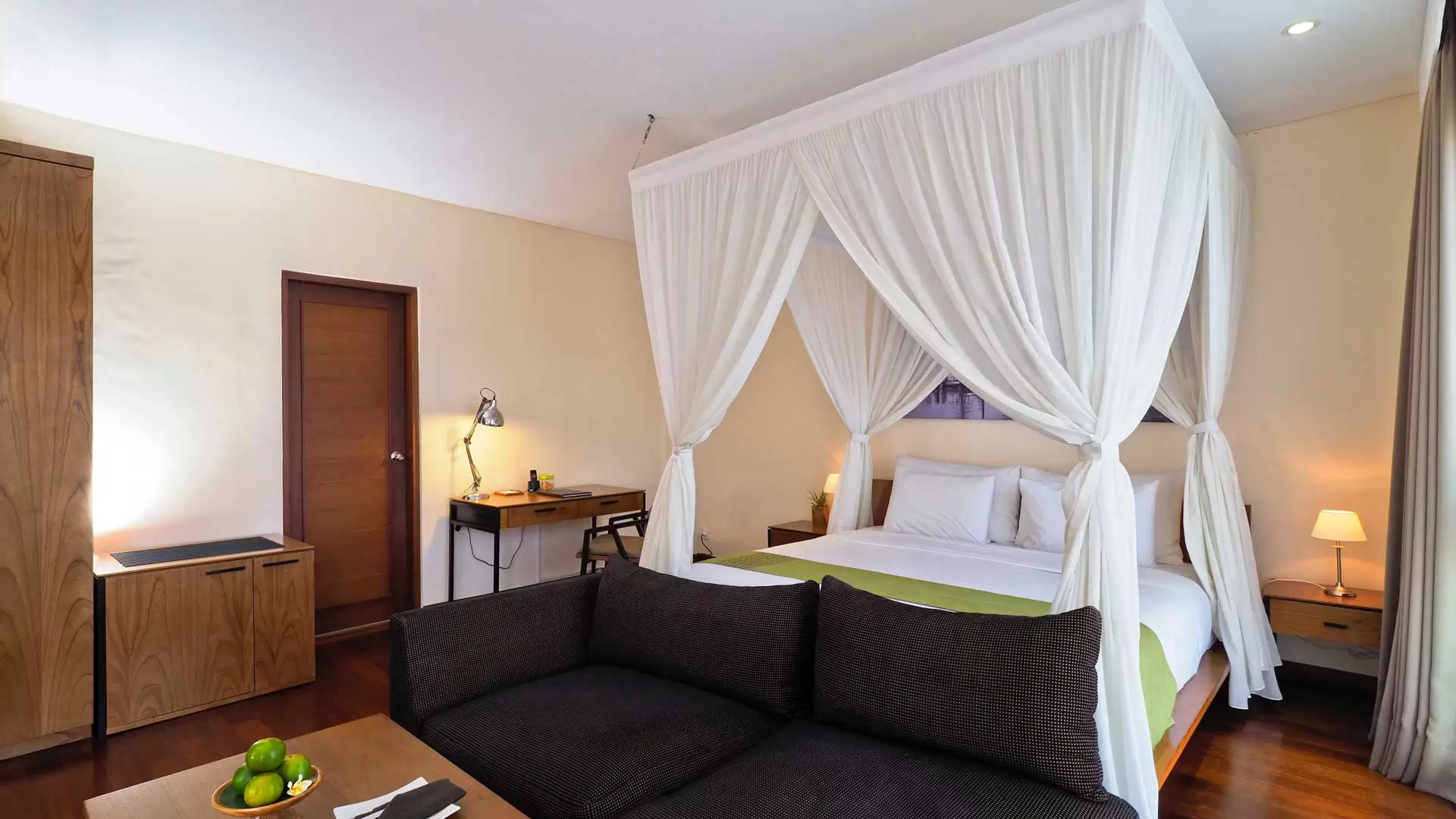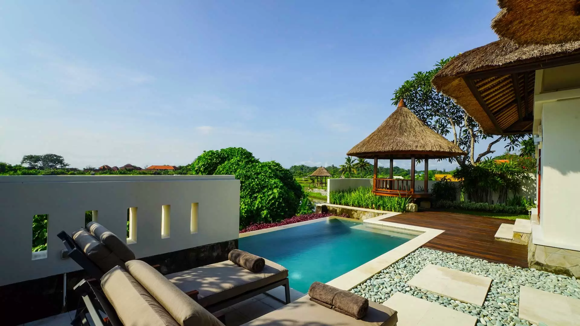 Our only One Bedroom Villa is simply stunning. The main building houses an elegant bedroom and a large modernist bathroom with aquamarine mosaic tiling, twin sinks and twin rainforest showers. Next to the building is an outdoor living/dining area which is perfect for breakfast or a romantic private dinner for two. The compound also has a Balé bengong (gazebo and daybed) where you and your partner can laze away the day, stirring only to take a dip in your private pool and gaze out over the rice fields. Perfect for a couple.