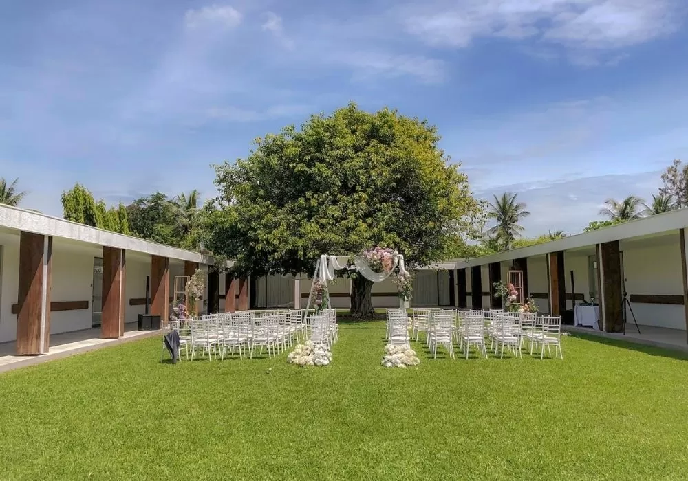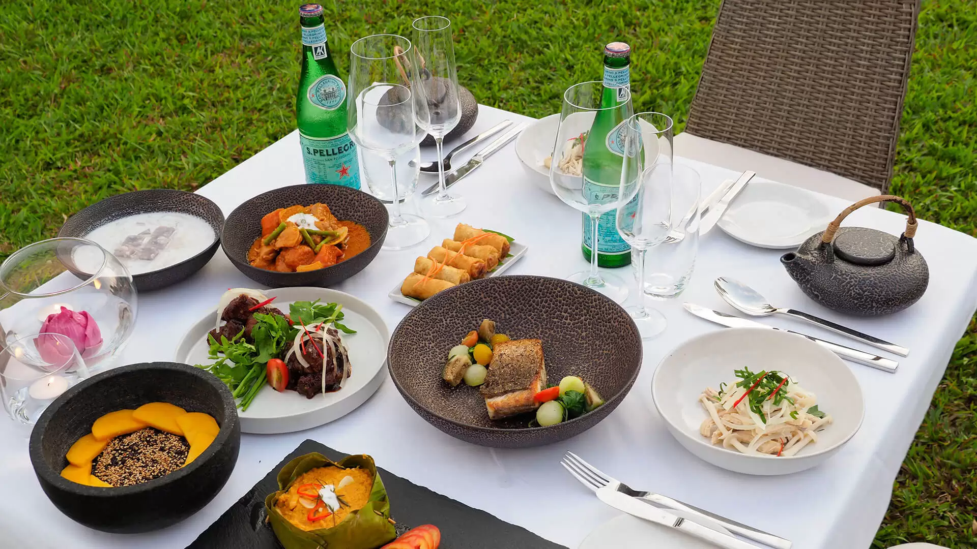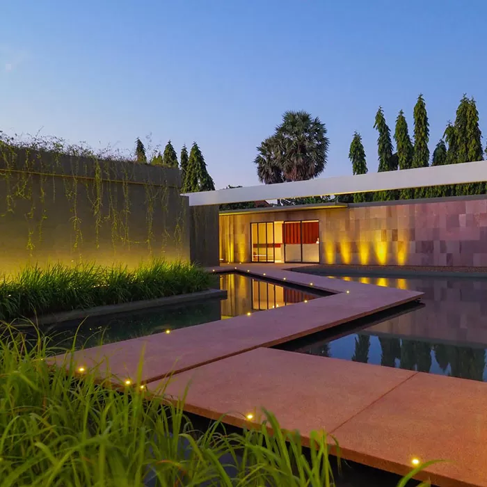 You arrive in great style, sweeping down a dramatic corridor, past a serene Buddha and along a pink, palimanan sandstone walkway across a black-bottomed infinity pond. Around the property are lemongrass plants and spider lilies, fragrant frangipani trees and vivid-green Lee Kuan Yew plants. Swim in the cool, riverside pool and dine by candlelight on fine cuisine under the tropical stars.