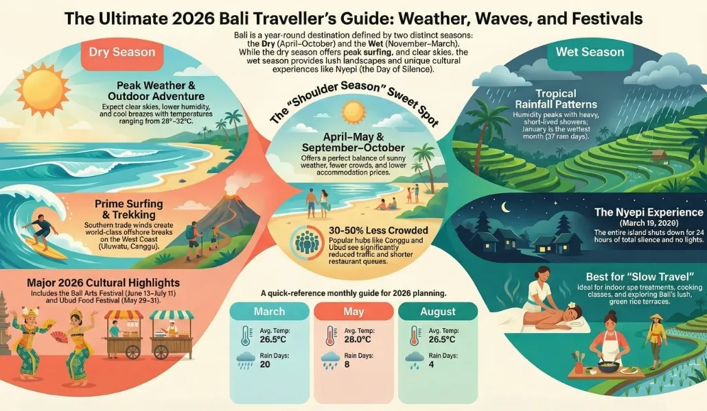 The dry season Bali travel period is especially popular for beach lovers, surfers, and travelers who want to explore Bali’s famous landscapes without worrying about frequent rain.