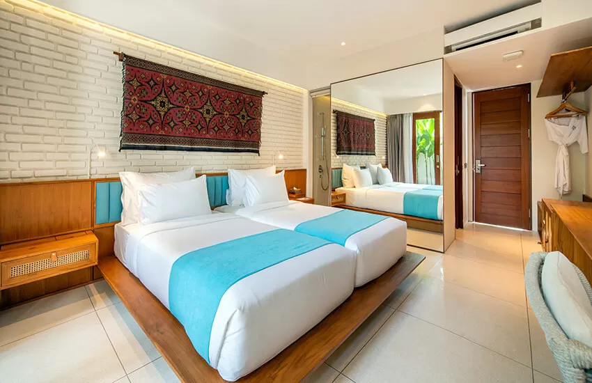 The hotel’s sensitive design includes traditional alang alang roofs and emerald backdrop vistas of village rice fields.