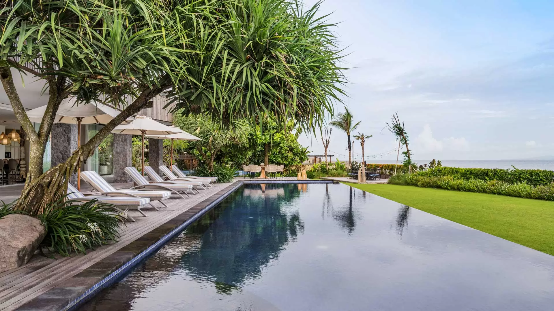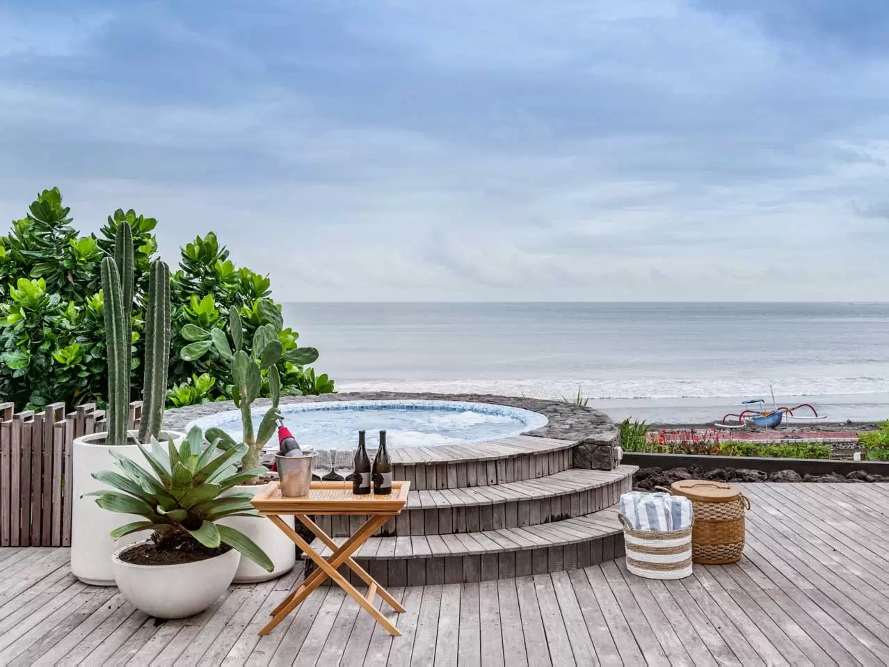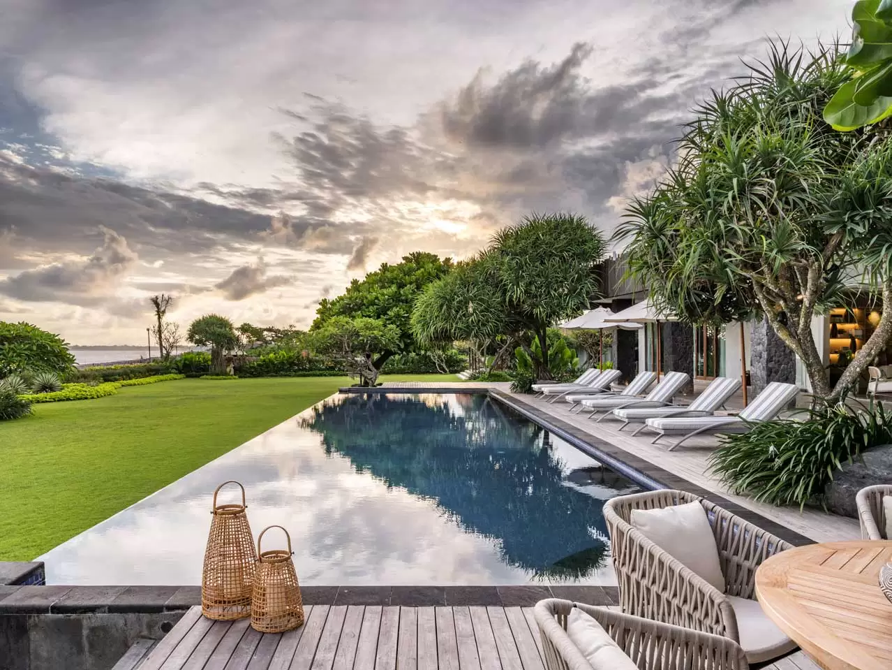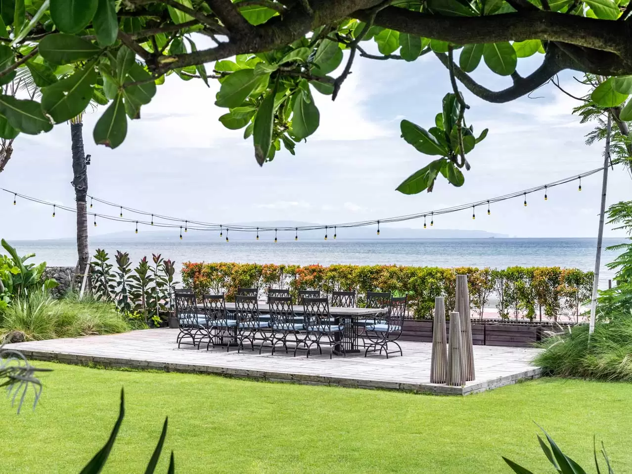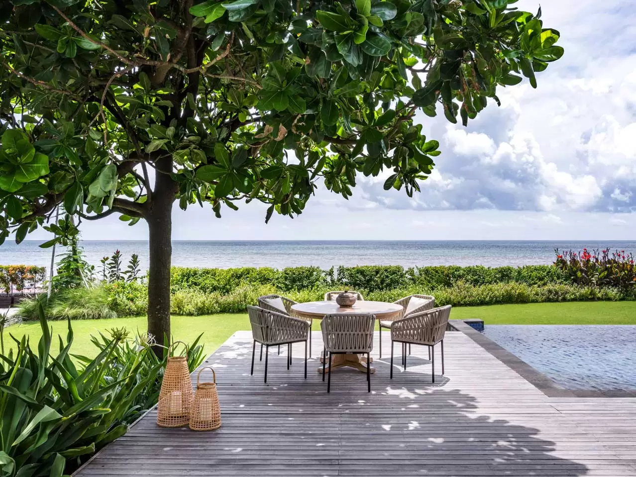 The lavish Villa Candani offers guests the ultimate absolute beachfront holiday experience, with manicured lawn and gardens, an infinity-edged swimming pool, indoor and outdoor living and dining, an upstairs terrace with Jacuzzi, games room, garden bar, a dedicated events kitchen, and restrooms.